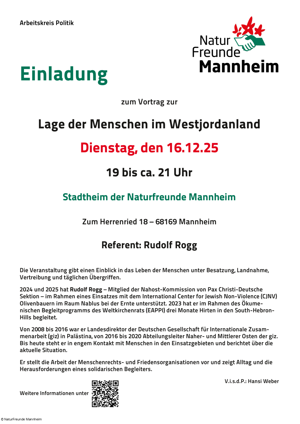 Wir freuen uns, an diesem Abend Rudolf Rogg bei den NaturFreunden Mannheim zu Gast zu haben. Er war unter anderem  Landesdirektor der Deutschen Gesellschaft für Internationale Zusammenarbeit (giz) und engagiert sich bis heute in Menschenrechts- und Friedensorganisationen in Palästina. Er kann uns so einen authentischen Eindruck von der aktuellen Lage im Westjordanland  und den Herausforderungen vermitteln.