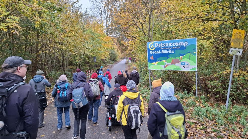 Die Geschichte dieses ehemaligen Naturfreundehauses ist natürlich besonders interessant für die NaturFreunde Region Rostock, die ihre Ortsgruppe erst im Januar 2024 neu gegründet haben. Am 2. November machten sie sich zu einer Wanderung in die Rostocker Heide auf, um vor Ort mehr über das ehemaligen Naturfreundehaus zu erfahren. Von Rostock-Torfbrücke aus führte der Weg zum heutigen Ostseecamp-Ferienpark Graal-Müritz. Dort begann dann die gemeinsame Spurensuche nach Hus Uhlenflucht.
