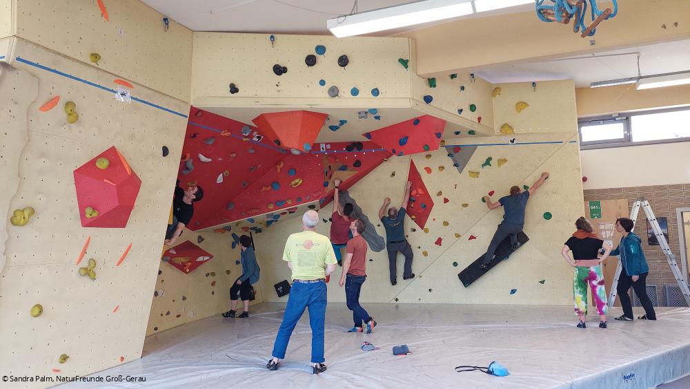 Am Samstag folgte dann ein praktischer Teil, bei dem von allen Teilnehmenden interessante Routen in verschiedenen Schwierigkeitsgraden geschraubt wurden. Dabei wurden verschiedene Themen wie zum Beispiel "Klettern mit Eindrehen", "Klettern mit Slopern" und "Klettern an Leisten" behandelt. Zudem mussten verschiedenste Kletter- und Boulderproblemstellungen bewältigt werden.