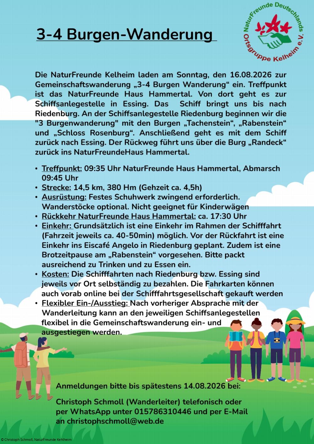 Die NaturFreunde Kelheim laden am Sonntag, dem 16.08.2026 zur Gemeinschaftswanderung „3-4-Burgen Wanderung“ ein.