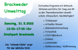 Beim ersten Brackweder Umwelttag brauchen die Besucher*innen keine Müllsäcke und Handschuhe mitbringen, denn es geht nicht um den „Frühjahrsputz“ im Stadtpark, sondern um um ein buntes Programm mit Informationen und Mitmach-Aktionen für Jung und Alt.